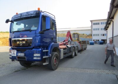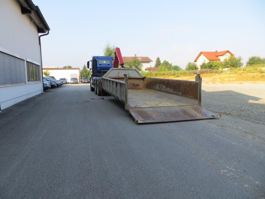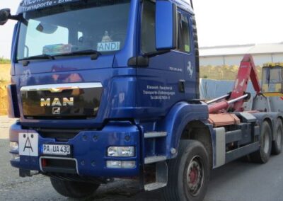 Wir führen zwei LKWs zum Transport von Abrollcontainern in unserem Fuhrpark.
